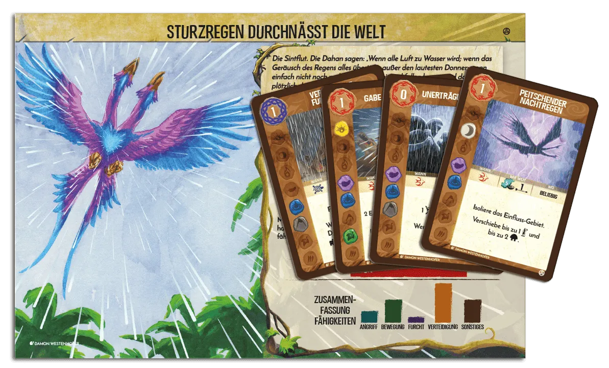 The Invaders expand across the island map in a semi-predictable fashion. Each turn they explore into some lands (portions of the island); the next turn, they build in those lands, forming towns and cities. The turn after that, they ravage there, bringing blight to the land and attacking any native islanders present. The islanders fight back against the Invaders when attacked, and lend the spirits some other aid, but may not always do so exactly as you’d hoped. Some Powers work through the islanders, helping them, for example, to drive out the Invaders or clean the land of blight.