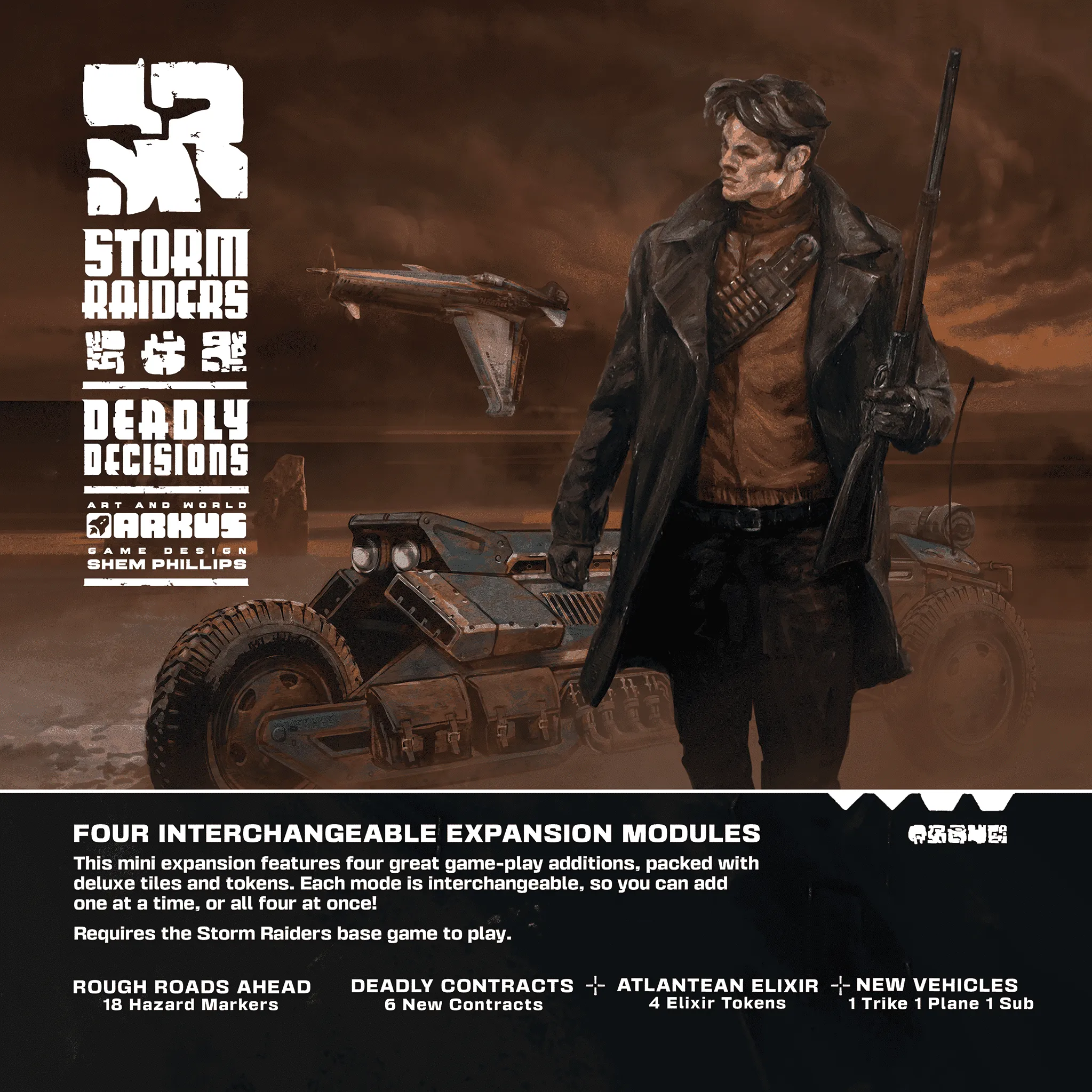 Pendant des milliers d’années, nous n’avons connu que la Tempête de la Faille. Elle a détruit notre empire, divisé notre terre et nous a coupés de l’Ancien Monde que nous gouvernions autrefois. À l’abri dans l’œil du cyclone, nous avons lutté pour survivre, emprisonnés dans notre dernière ville, nous accrochant désespérément à la vie. Au fil des siècles, l’œil s’est lentement agrandi, permettant d’explorer les environs de la ville et de faire une découverte surprenante. La tempête était toujours reliée à l’Ancien Monde, sa faille erratique capturant les malheureux qui tentaient de traverser l’Atlantique et les écrasant sur les côtes brisées de l’Atlantis. L’ère des Storm Raiders était née : des âmes courageuses qui, pour la gloire et la fortune, osaient défier la puissance de la Tempête de la Faille afin de sauver ces précieux trésors et d’apporter l’espoir à notre monde mourant. La saison des tempêtes approche, tous les regards se tournent vers le ciel et nous nous demandons si vous êtes le Storm Raider que l’Atlantis attendait. Le but de Storm Raiders est d’être le joueur le plus prestigieux à la fin de la partie. Les raids contre la tempête sont une tâche périlleuse, semée de nombreux dangers, le plus dévastateur étant la puissante tempête de la faille qui encercle les nombreuses îles. Les joueurs devront rester près de la tempête, sans se laisser submerger par sa force incommensurable. Le prestige s’acquiert en récupérant des épaves, en remplissant des contrats, en recrutant des équipages, en améliorant ses véhicules et en gagnant des médailles. À chaque tour, les joueurs lanceront des dés pour choisir s’ils souhaitent voyager à bord de leur avion ou de leur sous-marin, ou s’ils préfèrent prendre le temps de se reposer et de réparer leurs véhicules endommagés. Après 6 tours passés à traverser ce paysage déchiqueté, les joueurs additionneront leurs points de prestige pour déterminer qui restera dans les mémoires comme le plus grand Storm Raider de son époque.