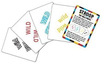 Les cartes de Stroop affichent chacune un seul mot. Les mots sont imprimés en plusieurs couleurs (noir, rouge, bleu et jaune), tailles (grandes et petites) et styles (creux et pleins), et ils comportent un nombre différent de lettres (trois, quatre, cinq et six). Le défi consiste à lire un mot et à le faire correspondre rapidement à la description d’un autre mot, sans tenir compte de ce que dit le deuxième mot.