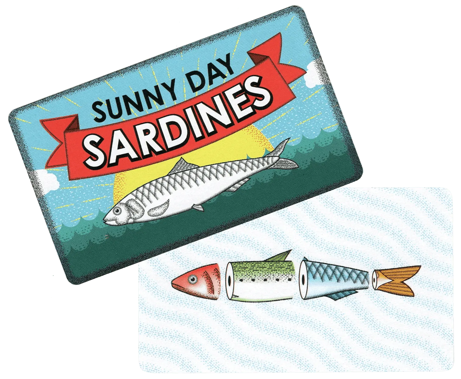 Sunny Day Sardines is a fun and quick pocket sized game where players take turns gathering sardines and using them to complete orders for points. Whoever has the most points at the end of the game wins and is named the Employee of the Month at the Sunny Day Sardines cannery.