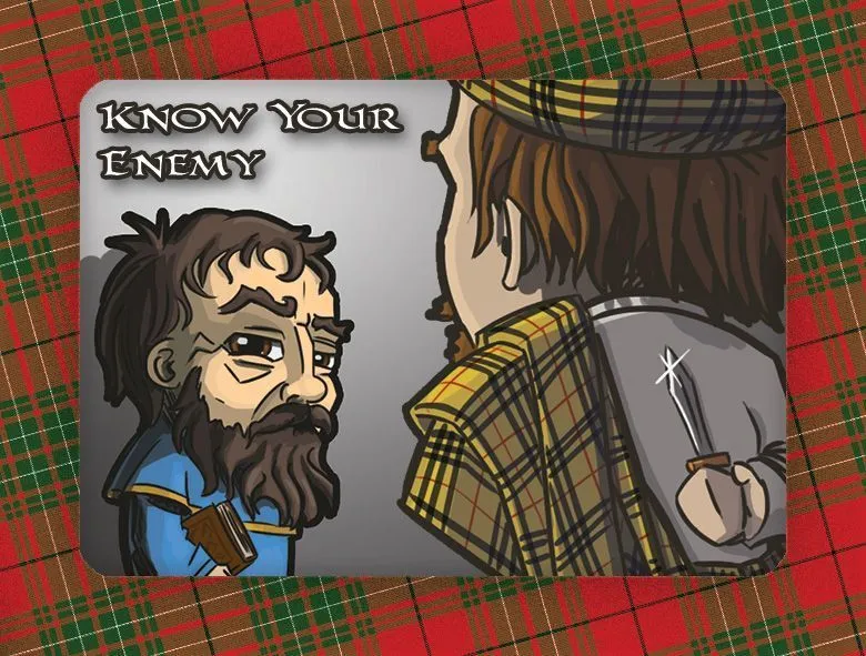 Each round, English army invades the lands of Scotland. Players take on the roles of Scottish clan leaders. They hire troops and send them to battle. Then each rival secretly decides which side he will support: England or Scotland. The Choice tokens are flipped simultaneously. Each side sums up their strengths (the traitors join the English army). Then the winning side of the battle is proclaimed.