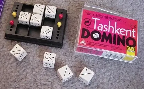 Tashkent Domino is a pocket size 2 player placement game using dice. There are 9 dice with each face divided by a diagonal line. Either side of the lines are 0 to 3 dots. Players take 4 dice each and roll them once only, placing them according to the top face. The starting player rolls the 9th die and puts it in the center of the 3x3 grid. Players then alternately place one of their dice on the grid, so that adjacent dots match, playing when possible. When no more dice can be placed, whichever has the least wins. If the dice are equal, the least dots win. Play is open, so you plan your moves to block your opponents’. Easy.
