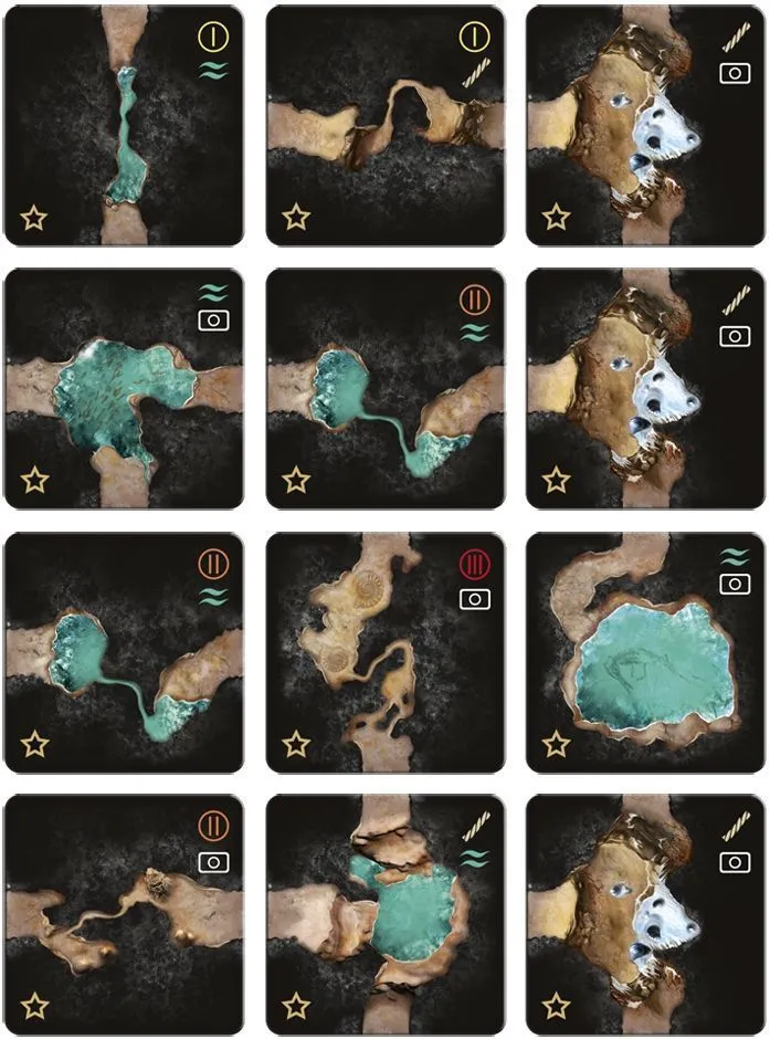 The cave differs every game, so players have to be prepared for everything or they will lose time. Players earn points for exploring different tiles: underwater, wondrous, descents, and so on – but to win they’ll need to acquire bonus prizes for exploring the most tiles of each type. This make decision-making during trips very difficult.