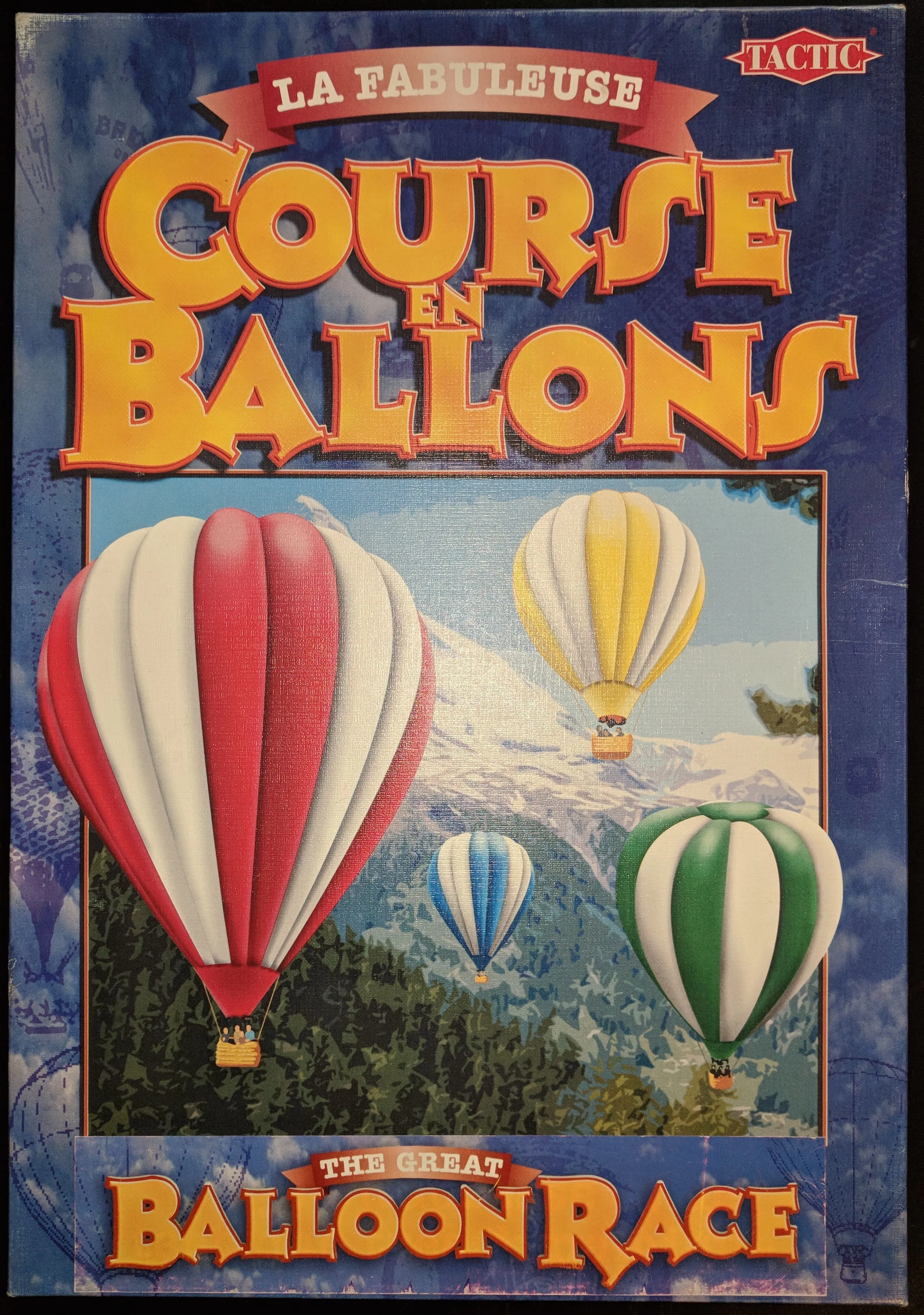 This is a light game – lighter than air, one might even say – in which each player starts the game with a card assigning a secret interest in three different balloons. The balloon markers are lovely little brightly colored plastic gadgets, and on your turn you roll a die and choose which of the eight you want to move. Some spots you land on give you a free roll; from some you can only go backwards. With much shucking and jiving the balloons gradually float and bump up toward the finish line whilst players feign disinterest in their own colors in hopes they’ll be promoted by others. When all three of your balloons reach the finish, you can claim victory.