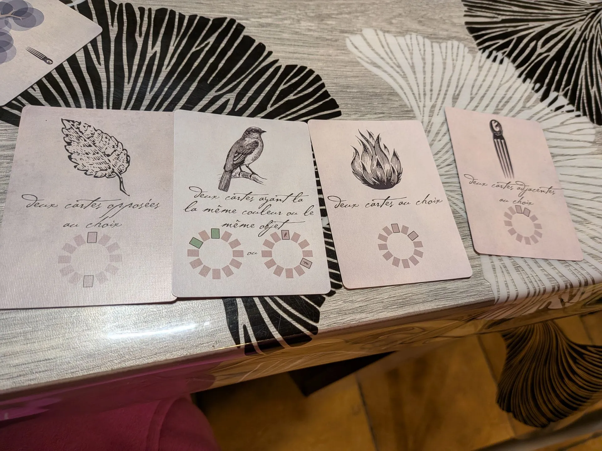 Pour commencer, mélangez les douze cartes d’arbre et placez-les dans un anneau comme le cadran d’une horloge. Toutes les cartes doivent avoir leur côté fleuri révélé et les troncs doivent être orientés vers le centre de l’anneau. Chaque carte représente également l’un des quatre objets. Placez la carte « jeune fille » à l’intérieur de l’anneau, à la position 12 heures.