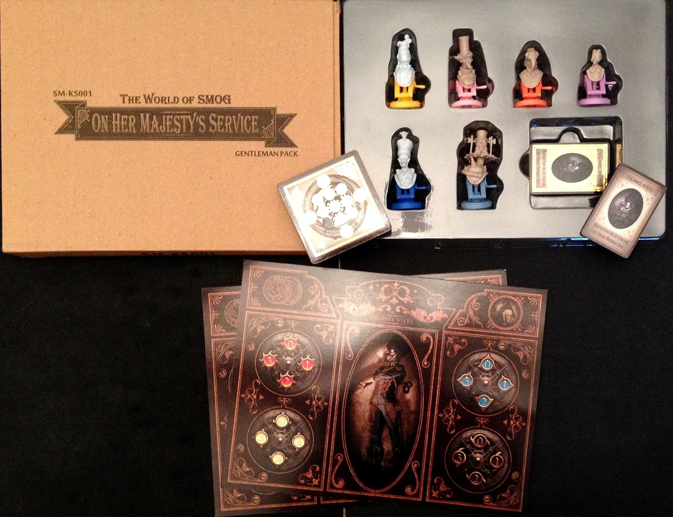 Set in the fantastic steampunk The World of Smog created by Panache Animation, On Her Majesty’s Service is a stylish board game for two to four competing players. You’ll need to navigate the rotating tiles that make up the game board, trading Ethers and Artefacts in order to fulfill the quest set by Queen Victoria, all the while dealing with the Agents of the Shadow Master.