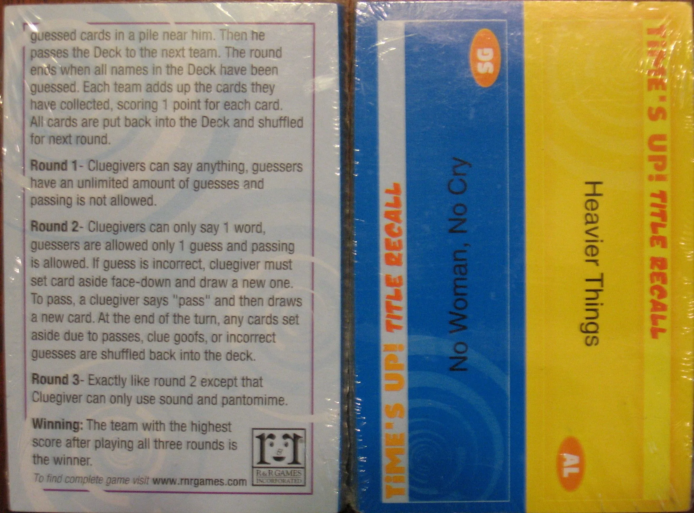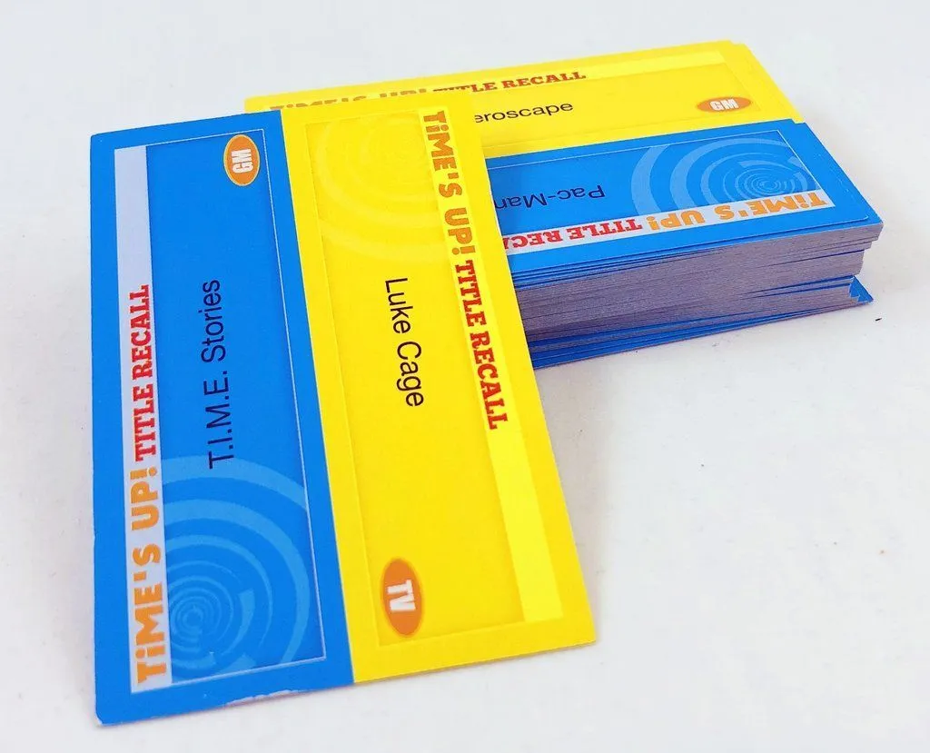 Based on the popular game Time’s Up!, Time’s Up: Title Recall challenges players to guess the titles of books, films, songs, and more. Players try to get their teammates to guess the same set of titles over three rounds. In each round, one member of a team tries to get their teammates to guess as many titles as possible in 30 seconds. In round 1, almost any kind of clue is allowed. In round 2, no more than one word can be used in each clue (but unlimited sounds and gestures are permitted.) In round 3, no words are allowed at all.