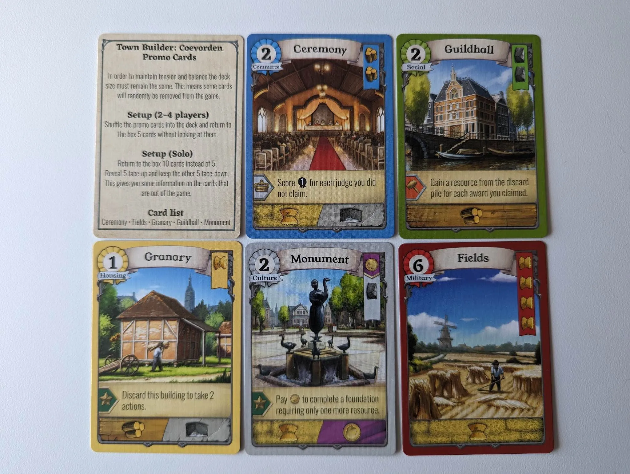 In Town Builder: Coevorden, players will draft multi-use cards from a center row of cards to build their own tableaus. Each town card can be used in 3 ways; as a foundation, as a resource and as a completed building with unique abilities. The players can aim for Awards or the favour of the Judges to gain extra points. The game ends when the players have played through the entire deck of cards a certain number of times based on the number of players. At the end of the game, the player with the most victory points is the winner!
