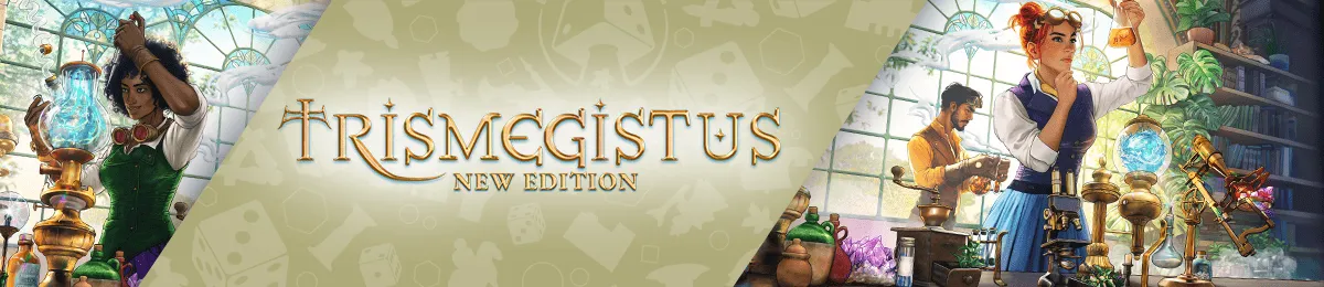 Trismegistus: The Ultimate Formula is played over three rounds during which you will draft exactly three dice. By expertly utilizing the potency of your drafted die, you will be able to transmute precious materials, collect alchemical essences, purchase and activate artifacts, and perform experiments that will progress you along four mastery tracks. You will also build a secret hand of publication cards which — together with the value of your experiments, the completed formulas of your Philosopher’s Stone, and your collected gold — will determine your final score in victory points and, perhaps, make you the greatest alchemist, someone able to rival Hermes Trismegistus himself!