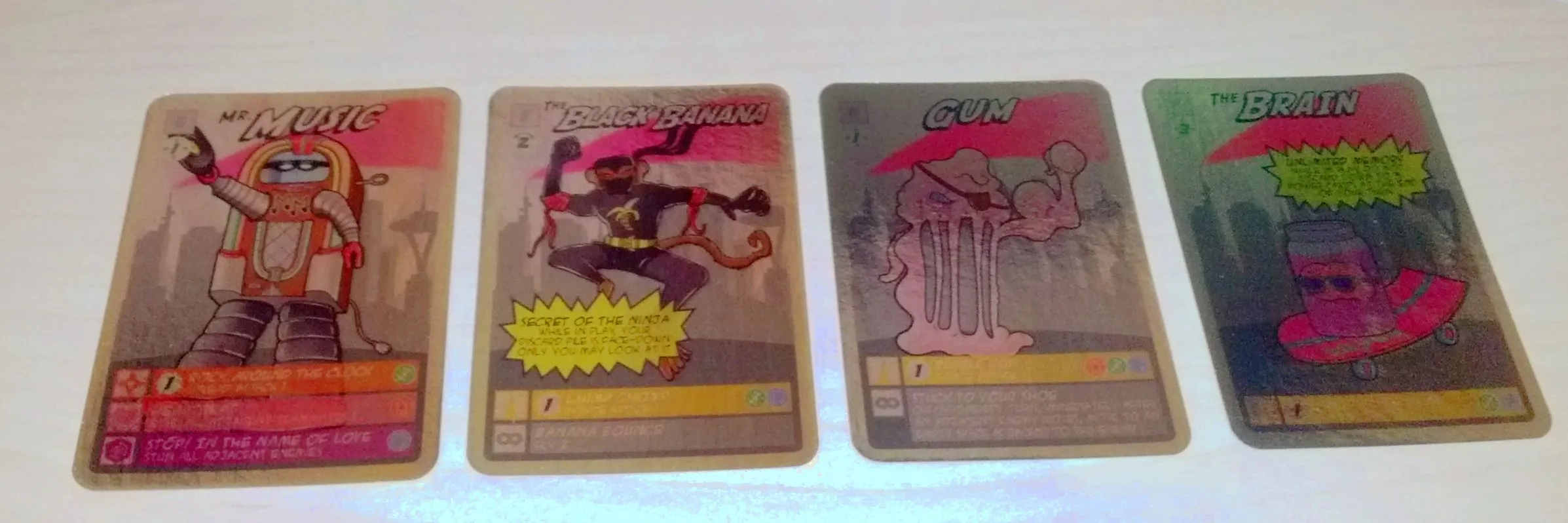 The heart of the game is the hero cards. They represent one hero in the game and are modelled after vintage trading cards. On the front side is a picture of the hero, and all the gameplay info about their powers; on the back are fun stats and an origin story!
