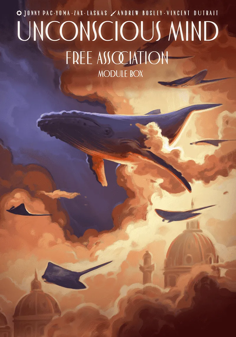 Unconscious Mind is a euro-style game featuring worker placement, engine building, multiple rondels, and cascading effects. On your turn, you may place one or two Ideas (workers) on a central Meeting Table to access a variety of actions, such as adding tiles to your player board, drafting and playing cards, and moving around the city of Vienna. Where you place your Ideas also determines how far to advance your rondel’s inkpot, activating a row or column of tile effects on your player board.
