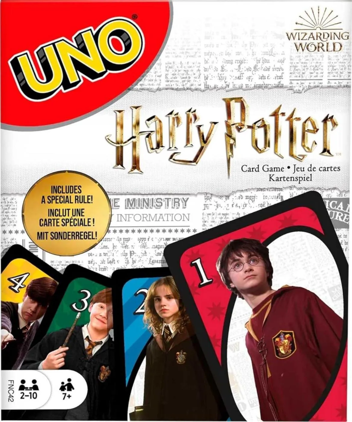 Les règles du jeu sont les mêmes que pour le UNO classique, mais les cartes sont représentent Hermione, Harry, Ron et des autres personnages de la saga Harry Potter ! L’objectif est d’être le premier joueur à se débarrasser de toutes ses cartes, et le premier joueur ou la première équipe à atteindre 500 points.