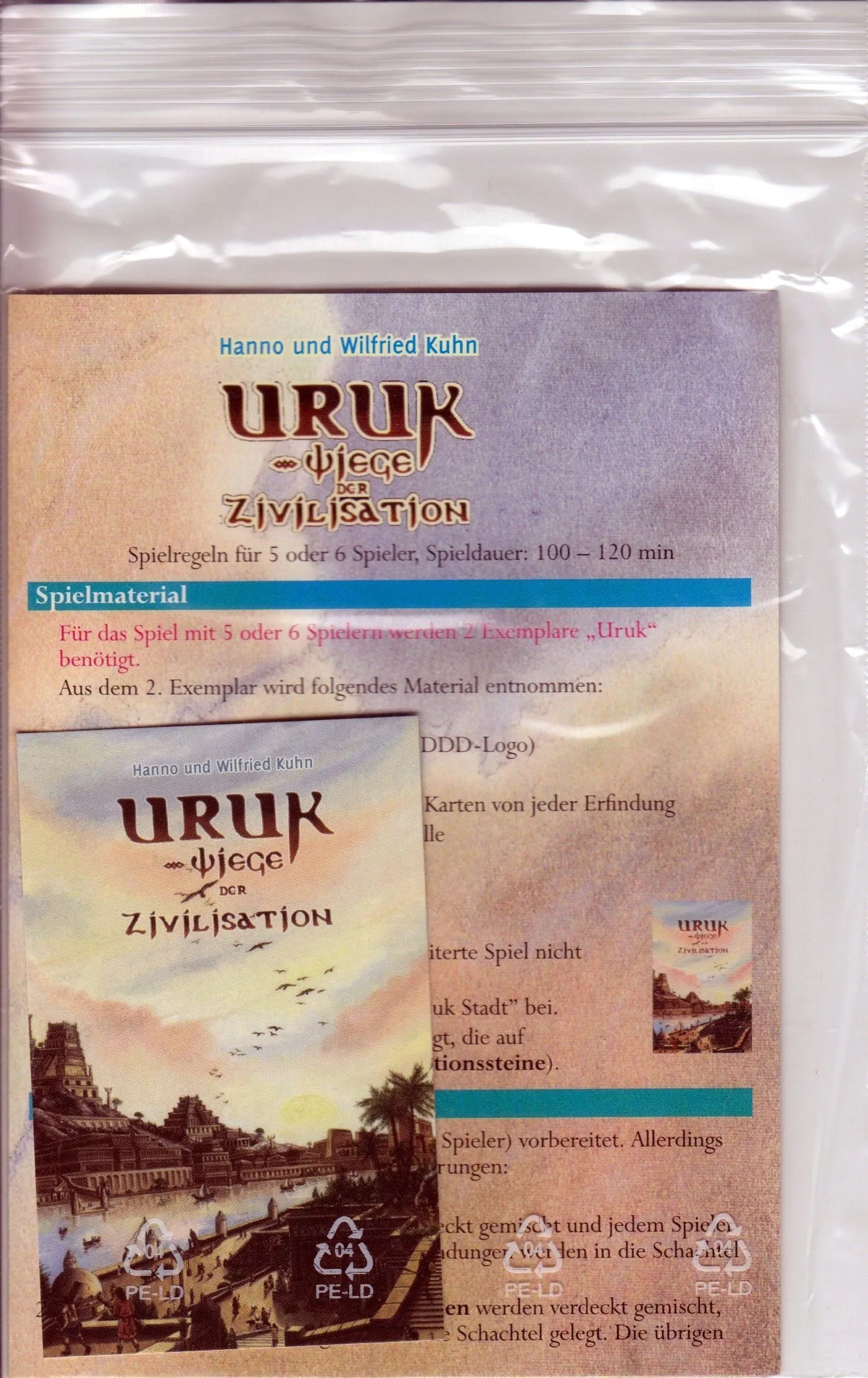 In 3000 BC, Uruk was the largest walled city in the world. In Uruk: Cradle of Civilization, each player builds up a civilization on the Euphrates, consisting of settlements built around various inventions. Starting with something as simple as a “mud hut”, by the end each civilization will have several inventions, such as the mighty “aqueduct”. Along the way, each civilization tries to avoid disasters and receive blessings from Sumerian gods. There is no military component in this game, and players cannot directly attack each other.