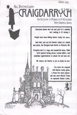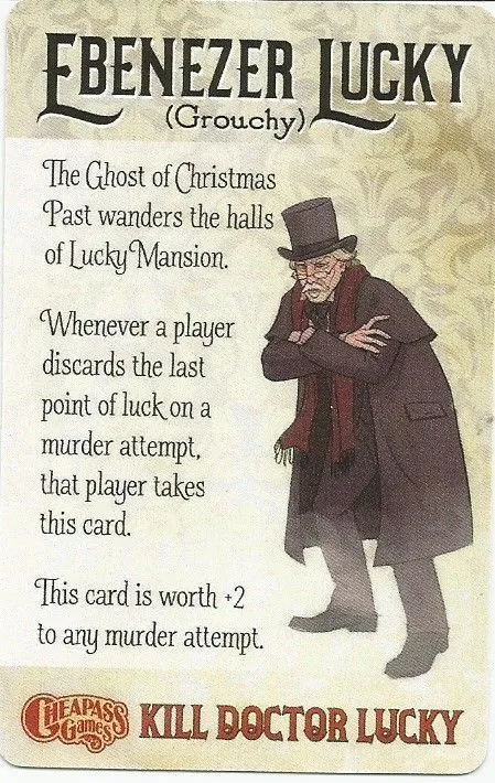 Players move around the mansion, collecting murder weapons (to make the murder attempt stronger - doubly so if the weapon is used in an appropriate location); failure cards (to thwart opponents’ plans); and movement cards (to try to get together with Doctor Lucky in a secluded location for his inevitable demise). Players try to convince others to use up their failure cards first, the better for when their own attempts come.
