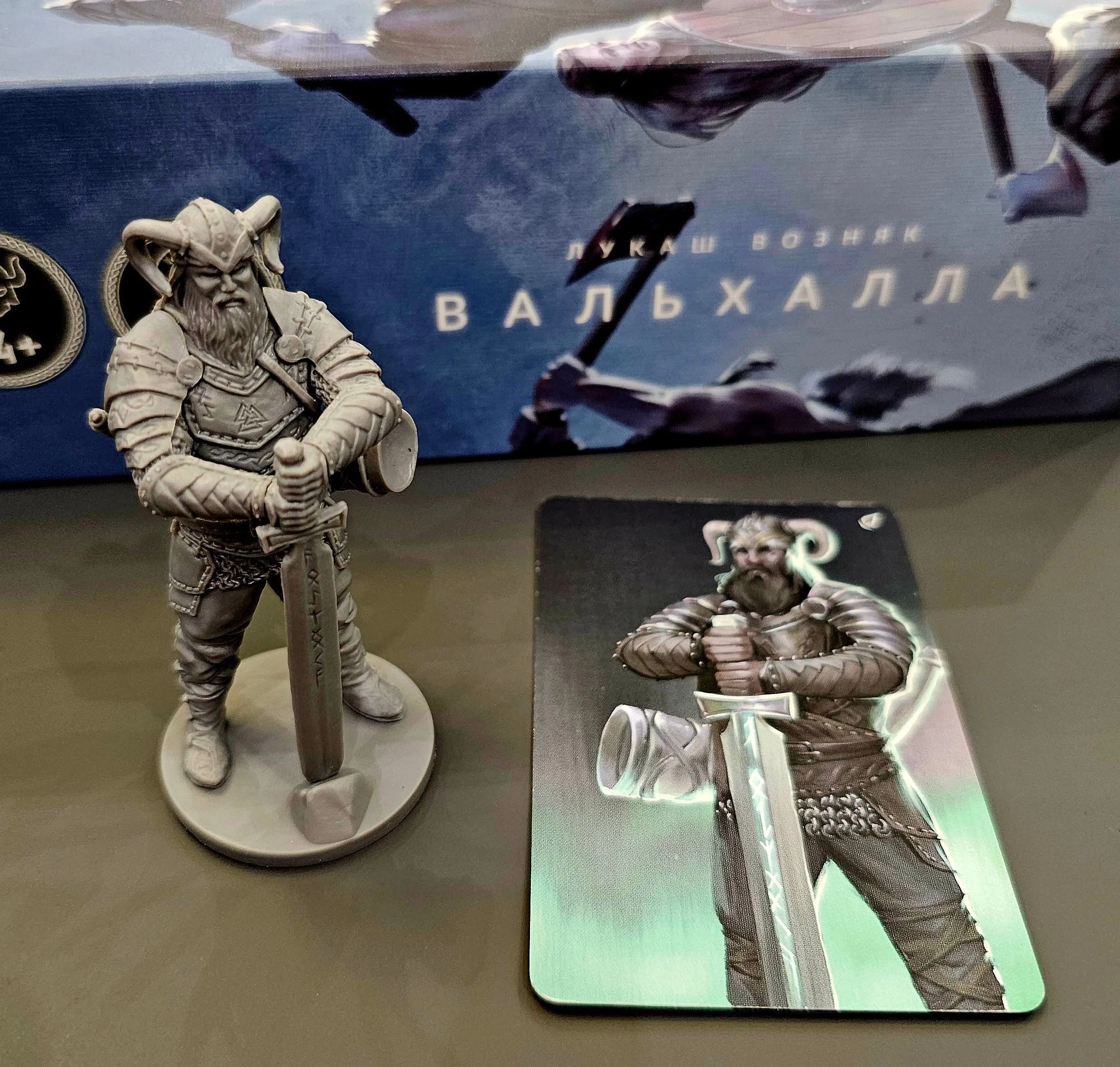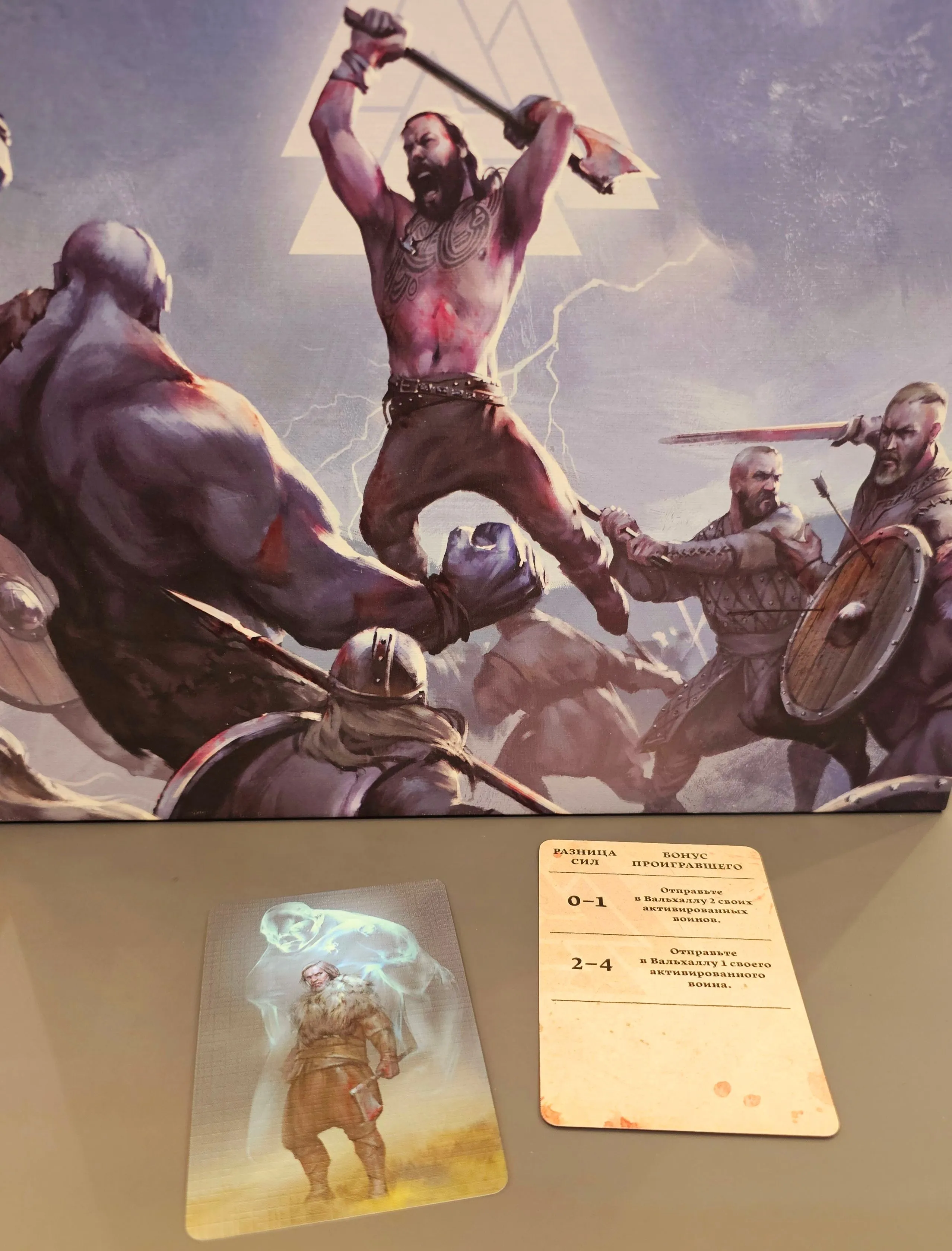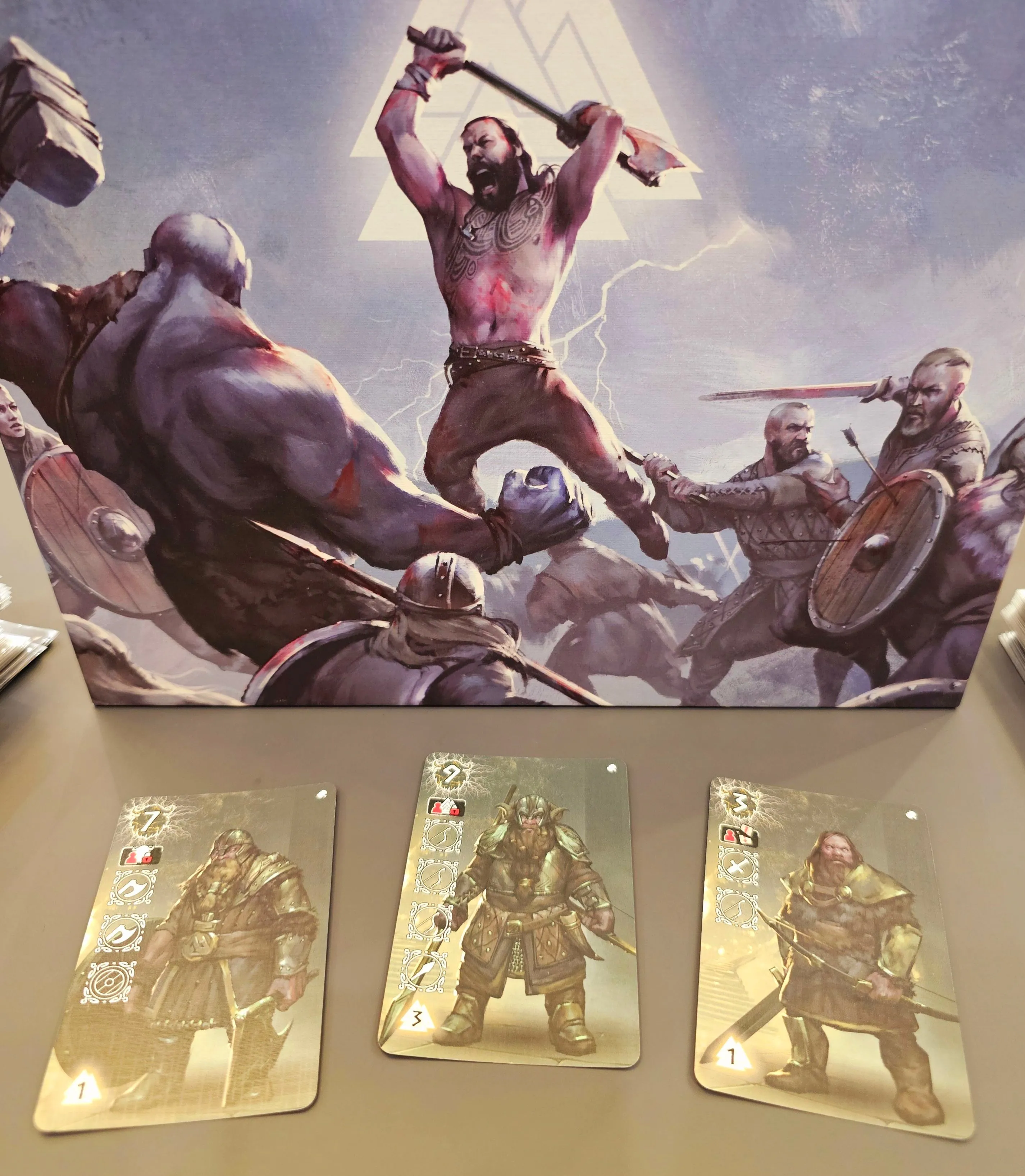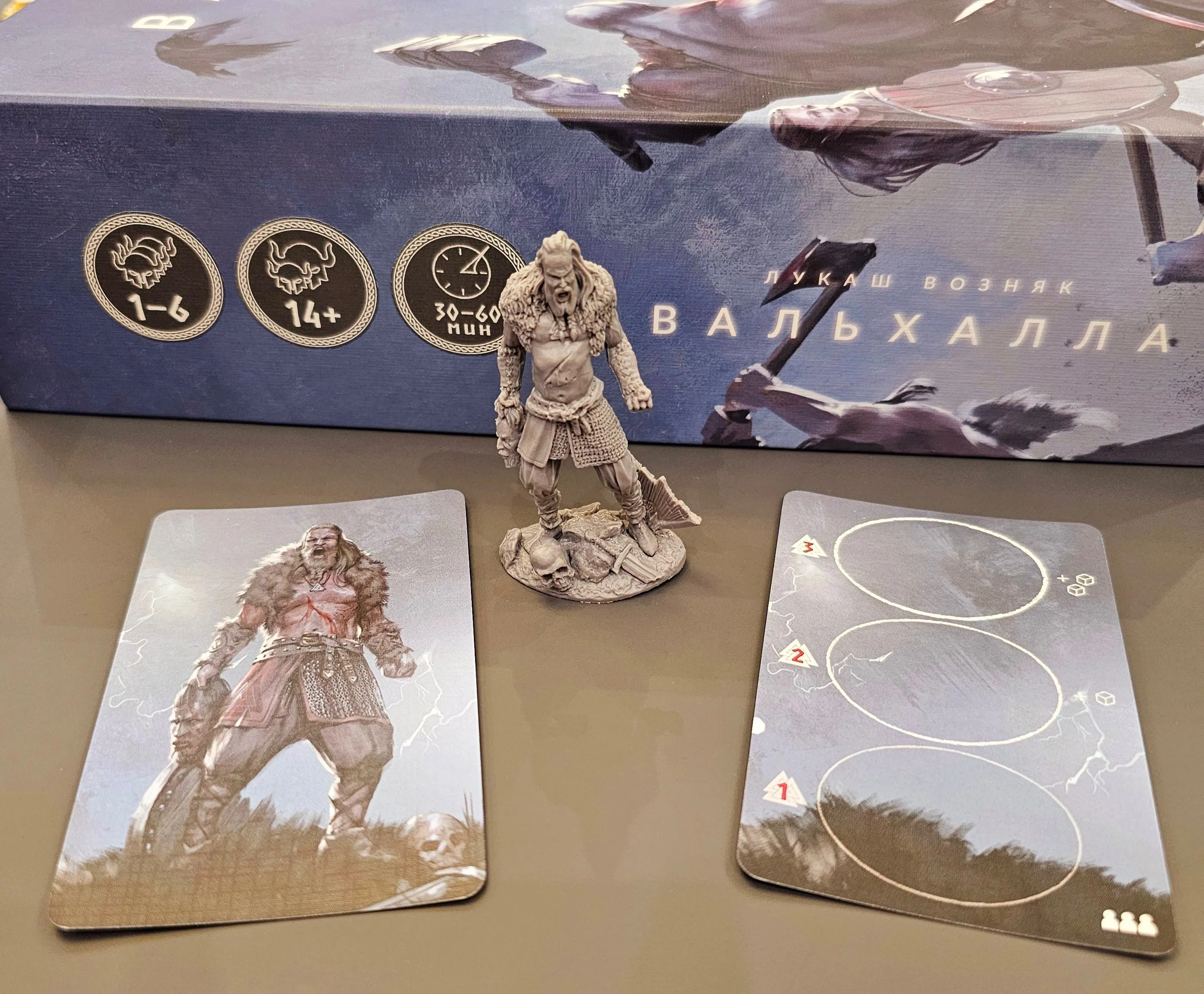 Valhalla is a card game with dice placement mechanics. Each player takes role of a Jarl who builds a team of warriors and equips them to fight. In battles player roll dice to activate warriors and play special tactic cards. The winning party sends their activated warriors to Valhalla, and whoever has the most points at the end, wins the game.