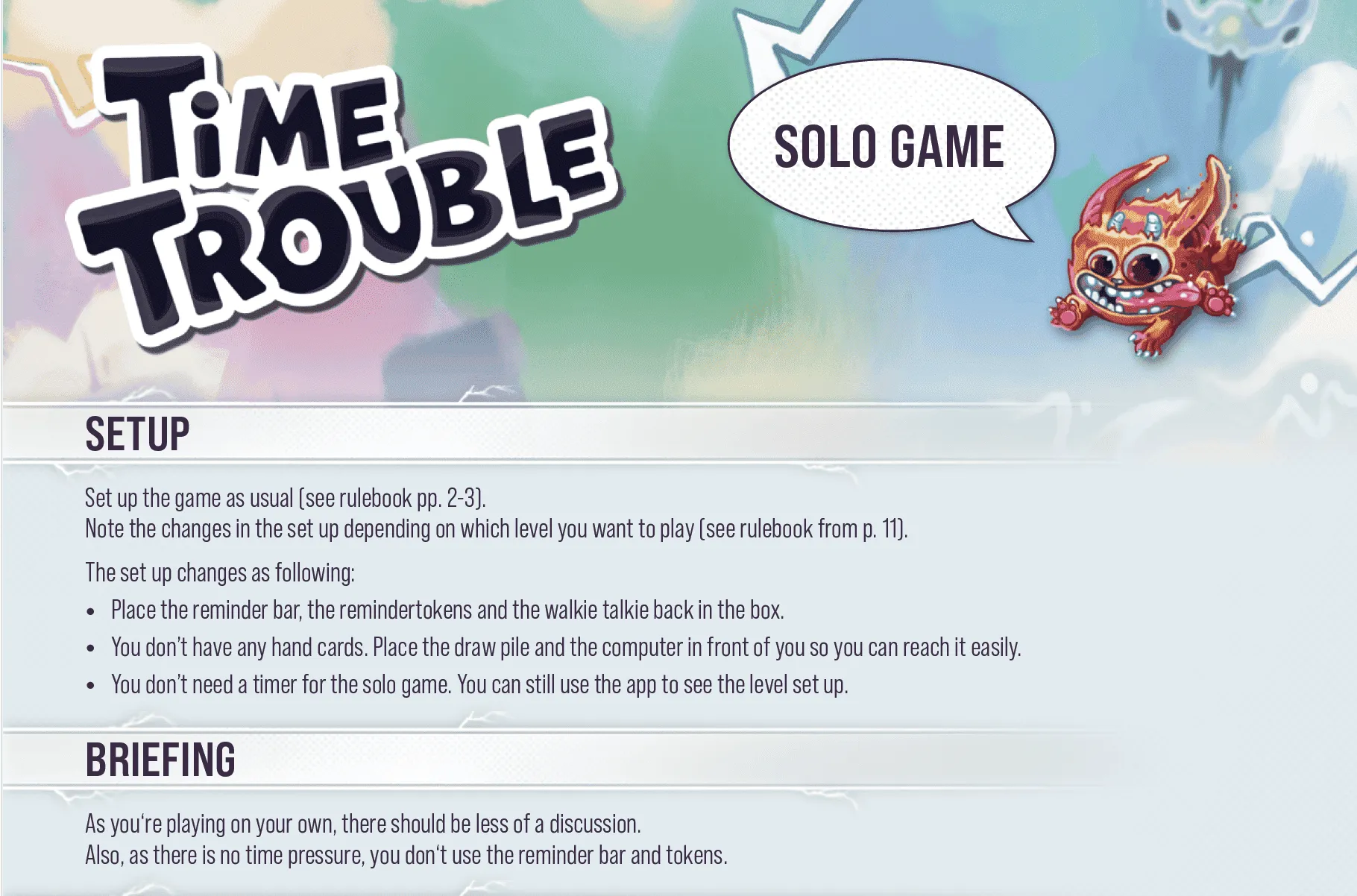 Dans Time Trouble vous faites voyager quatre adorables personnages à travers différents niveaux en plaçant des cartes transparentes les unes sur les autres. Votre objectif est d’attraper les Fluffys qui perturbent la chronologie temporelle. À chaque niveau, vous voyagez dans le temps pour relever de nouveaux défis. Ensemble, vous devez coordonner vos actions et utiliser les capacités des personnages pour réussir - mais vous n’avez que quelques secondes pour mettre vos plans à exécution !