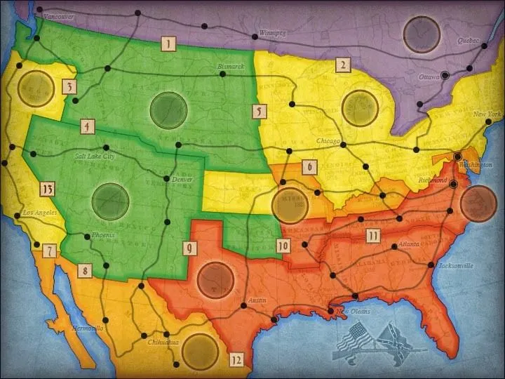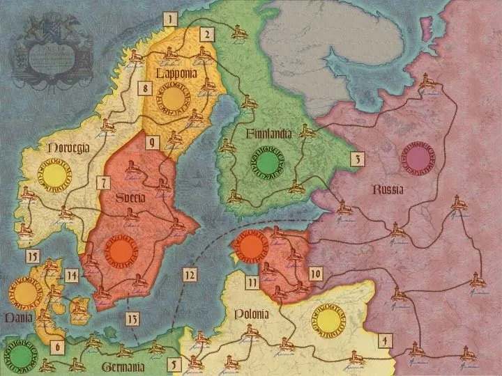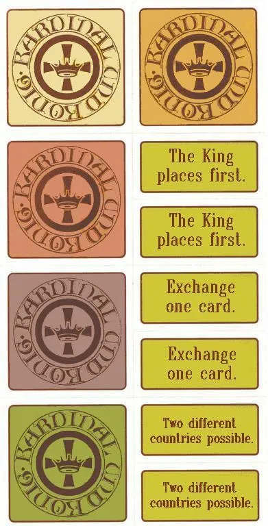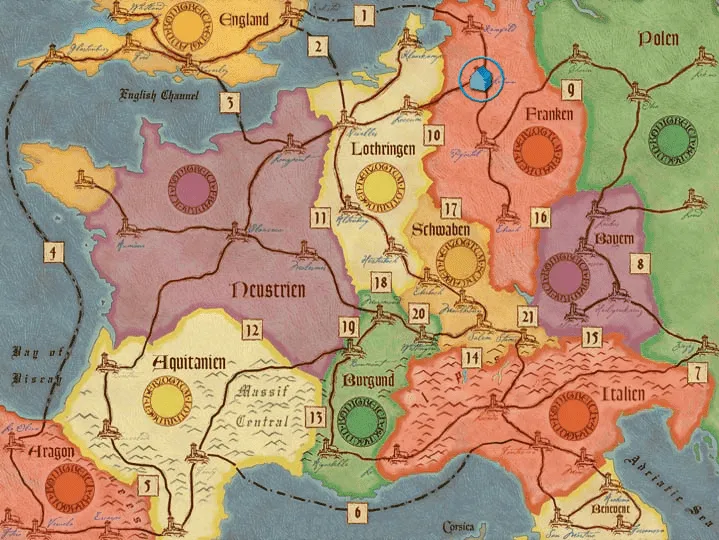 Players struggle for influence over regions of Europe by placing two different type of control markers, Monasteries and Advisors. Monasteries are the basic placement, with the goal of securing a majority in a region or chain of monasteries or even decent points from second place. The placement of the Advisors is more restricted as the total number of Advisors in a region is limited by the majority player’s number of monasteries. The game is played in two rounds and is very fast paced.