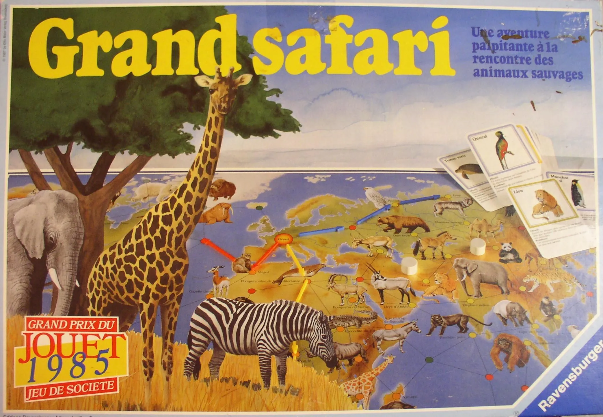 In Wildlife Adventure, players guide expeditions around the world to locate endangered species. Each player gets to extend one expedition on their turn, and travel vouchers allow the player to make extra moves, place obstacles, or change their mission. The game ends when one player locates all of his animals.