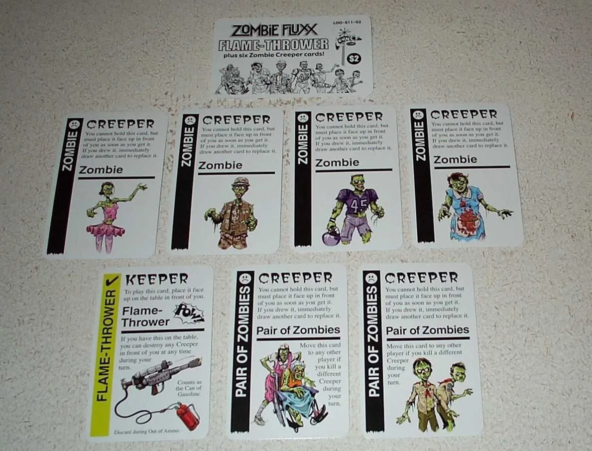Zombie Fluxx is the zombie uprising card game with ever-changing rules. There is now a new type of card: Ungoal cards (conditions in which everybody loses!)