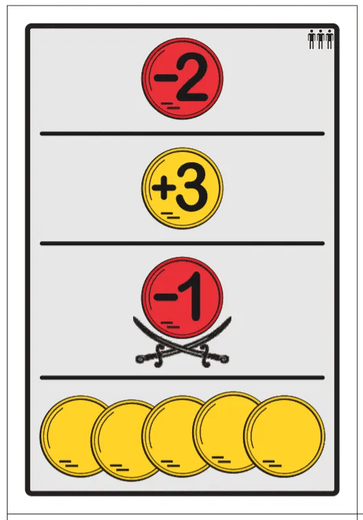 On the first turn, some number of players with the lowest-ranked cards pay two money to the kitty in the middle of the table; on the second turn, some number of players with the highest ranks each take three money; on the third turn, some number of players with the lowest-ranked cards pay one money to the kitty and drop from the round; and on the fourth turn, the player with the highest-ranked cards takes the kitty. The number of players who pay or win money varies depending on the number of players. Rounds continue until someone runs out of money, then the player with the most money wins.